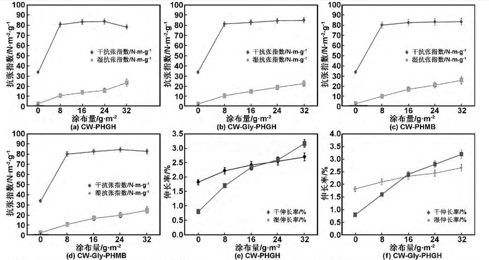 改性棕櫚蠟乳液涂布量對紙張機械性能的影響如圖4所示??梢园l(fā)現(xiàn)改性棕櫚蠟乳液對紙張的機械性能有著積極的作用,相對于原紙(70g/m2),涂布有改性棕櫚蠟乳液的紙張干/濕強度、伸長率、耐破性能均有明顯的提高。由于涂布4種改性棕櫚蠟乳液后的紙張的機械性能都呈現(xiàn)出明顯的增強作用,因此本文選取了具有代表性的CW-PHGH乳液進(jìn)行下文的論述。從圖4可以看出,當(dāng)紙張的CW-PHGH涂布量為24g/m2時,紙張的干抗張指數(shù)從原紙的33.57N·m/g增加了1.5倍,達(dá)到84.34N·m/g;伸長率由原紙的1.82%增加到2.55%,增加了0.4倍;紙張的濕抗張強度由原紙的2.21N·m/g增加了6倍,達(dá)到15.64N·m/g,伸長率由原紙的0.8%增加到2.6%,增加了2.25倍。作為包裝紙重要參數(shù)的耐破指數(shù)由原紙的1.94kPa·m2/g增加到2.28kPa·m2/g,增加了0.17倍。認(rèn)為紙張強度的改善是由于CW-PH-GH乳液在纖維網(wǎng)絡(luò)中滲透,增加了纖維束纖維與乳液微球間的接觸面積,從而通過氫鍵及靜電引力等作用的加強而提高了其內(nèi)部結(jié)合力。