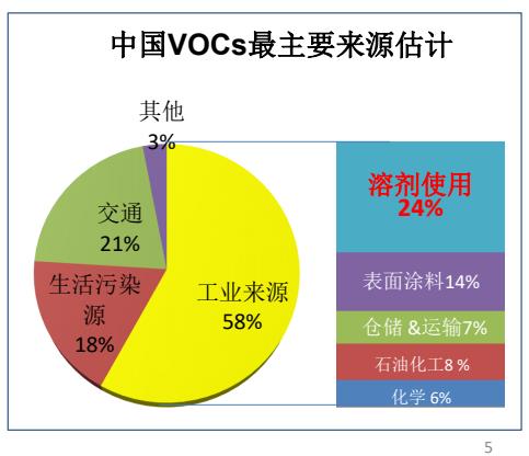 中國(guó)VOCs最主要來(lái)源估計(jì),其中工業(yè)來(lái)源占比最大,而工業(yè)來(lái)源中VOC大部分來(lái)自溶劑。