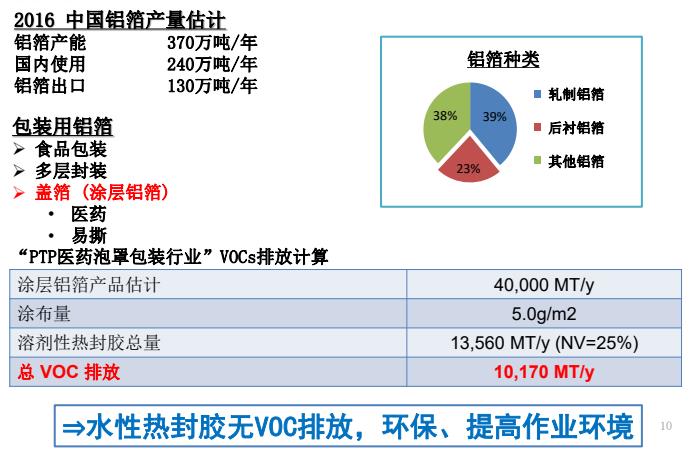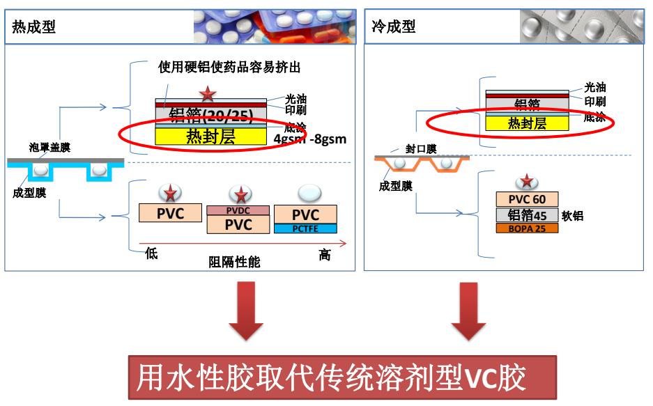 熱封膠產(chǎn)品主要應(yīng)用在熱封層,分為熱成型和冷成型2種工藝。在熱封層中使用水性膠取代傳統(tǒng)溶劑型VC膠,可以減少VOC排放,提高作業(yè)環(huán)境。